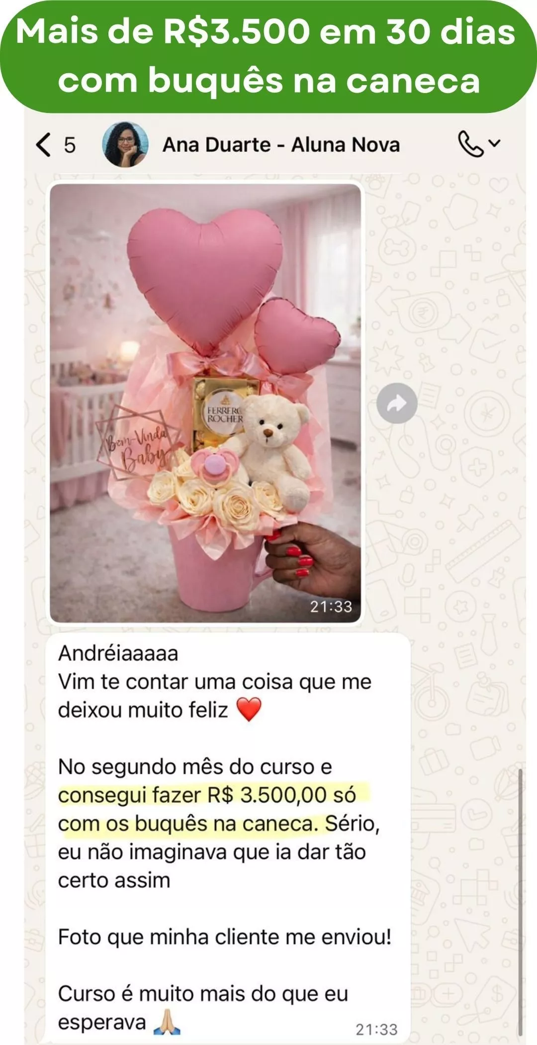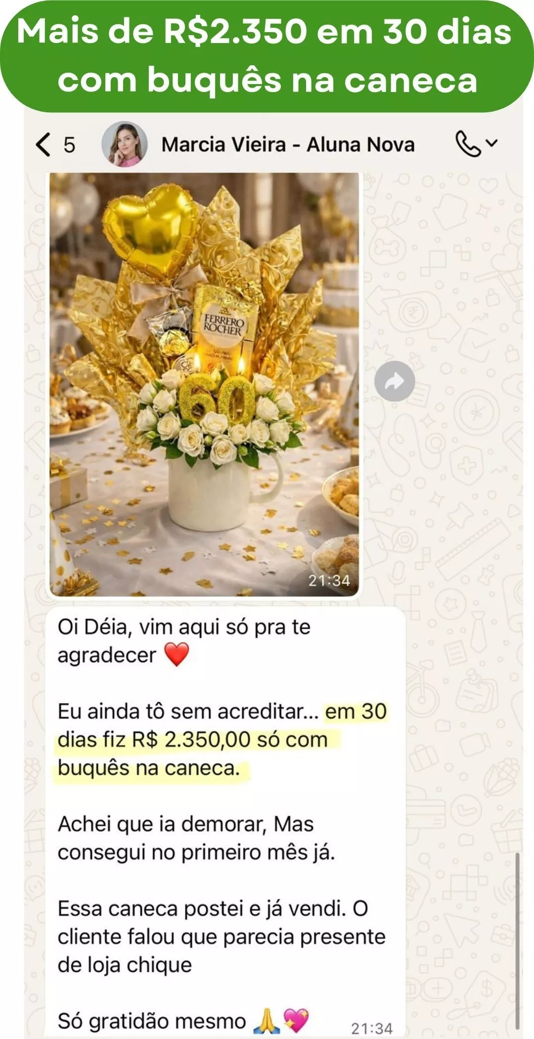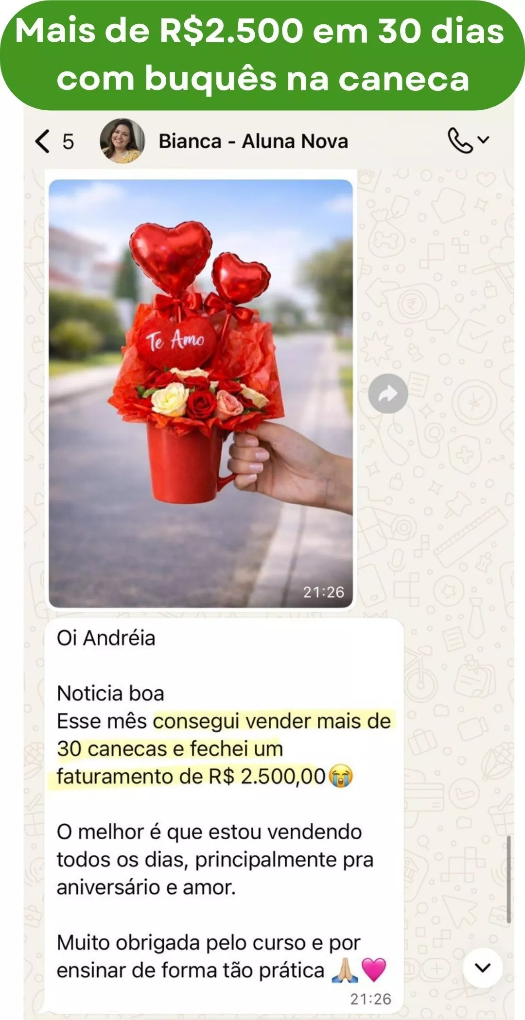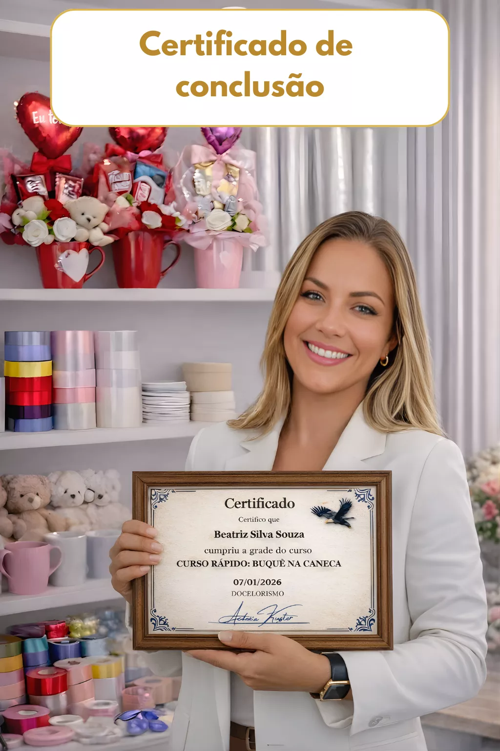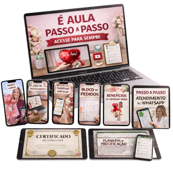 Não precisa de alto investimento nem de muito estoque. Os buquês na caneca usam materiais acessíveis, têm demanda real todos os dias e não dependem apenas de datas comemorativas. No projeto, você aprende não só a montar, mas também a precificar corretamente, divulgar, atender e vender. Por isso, muitas alunas conseguem fazer as primeiras vendas no mesmo dia ou logo nos primeiros dias após começar.